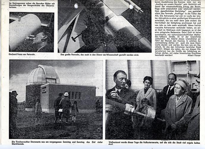 1964 wurde durch eine Gruppe Astronomie-Interessierter um Gerhard Franz die Sternwarte Tirschenreuth gegründet. Durch die Hilfe von vielen Spenden und der Mithilfe von ortsansässigen Firmen konnte schließlich eine ansehnliche Sternwarte mit Kuppel geschaffen werden.